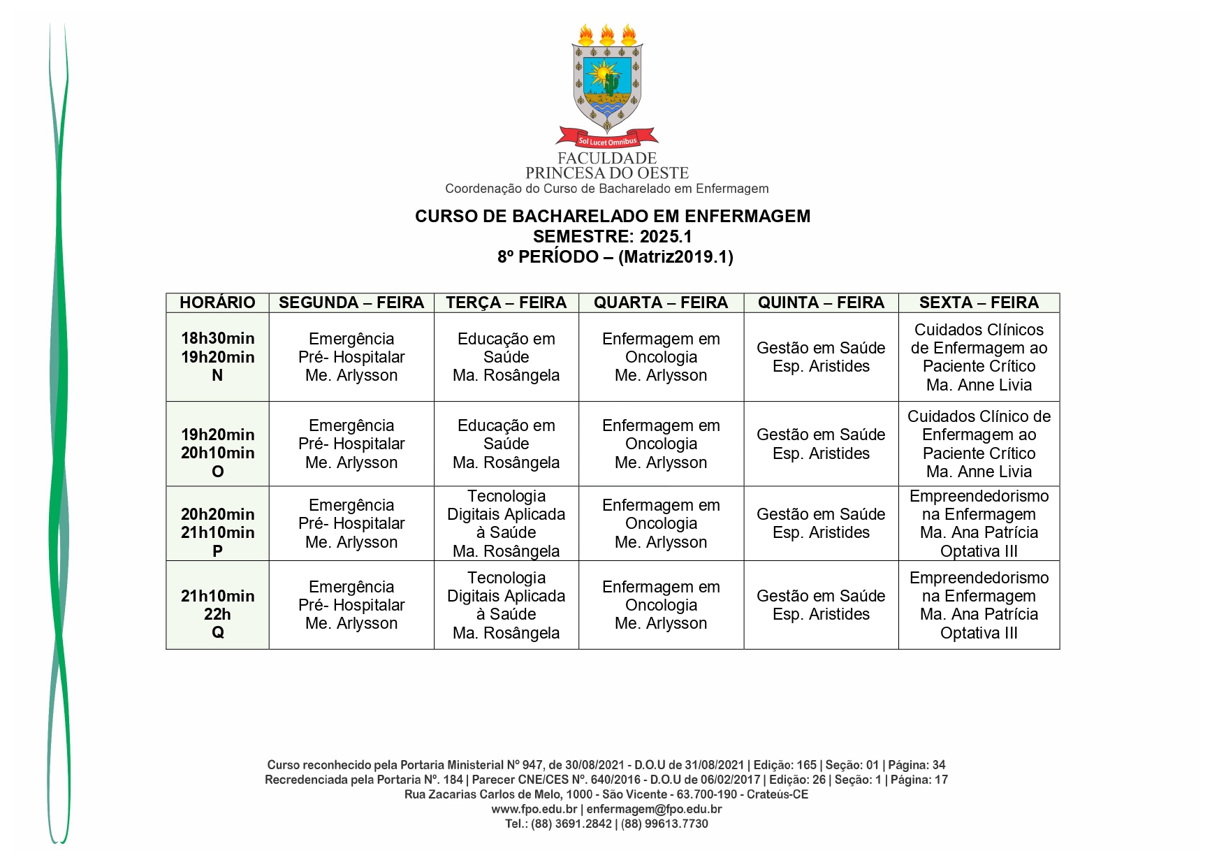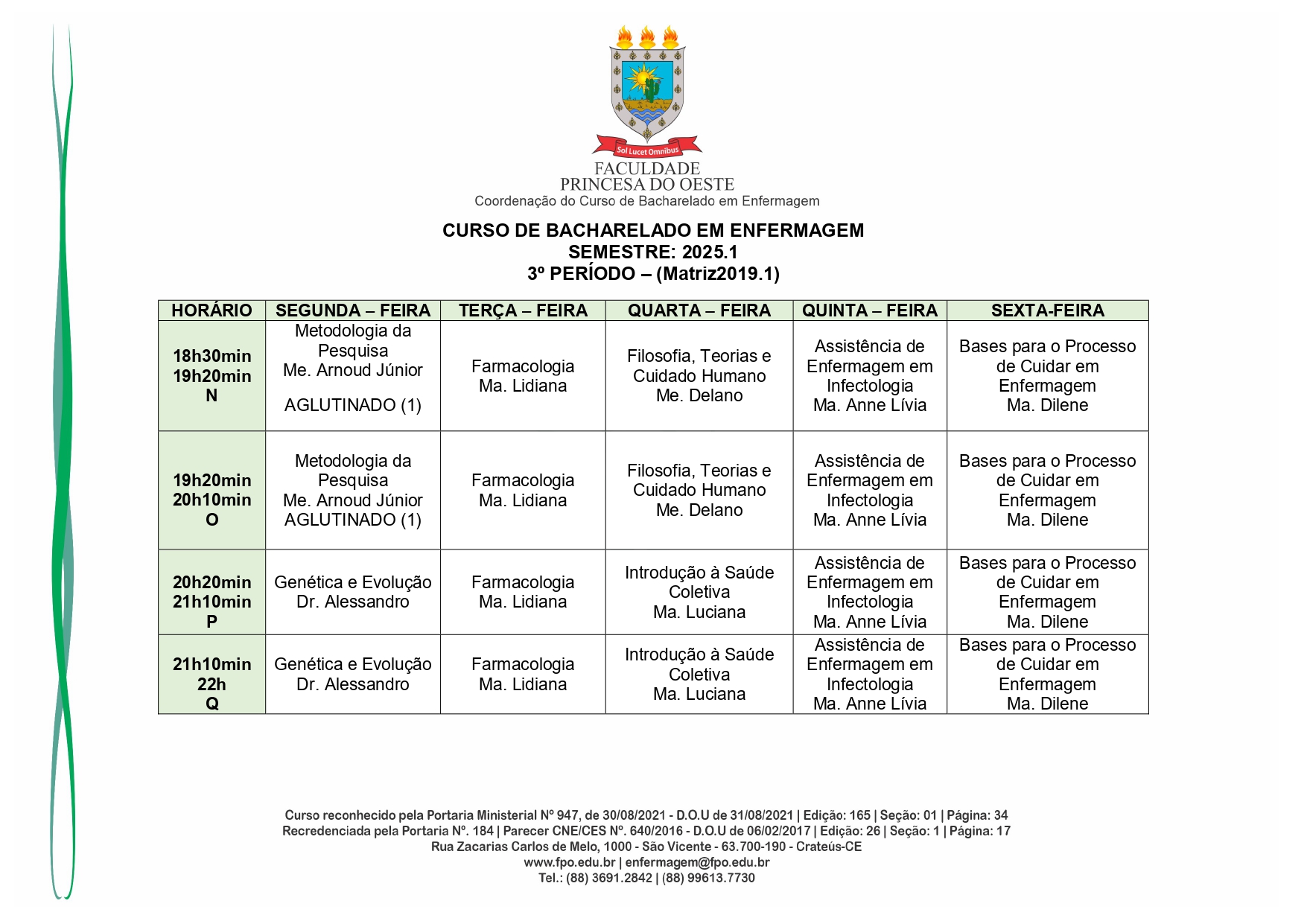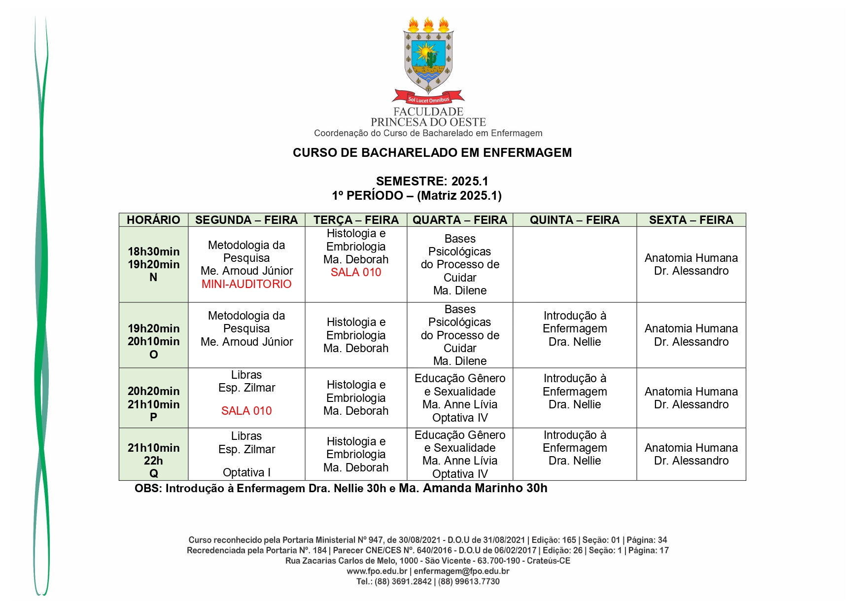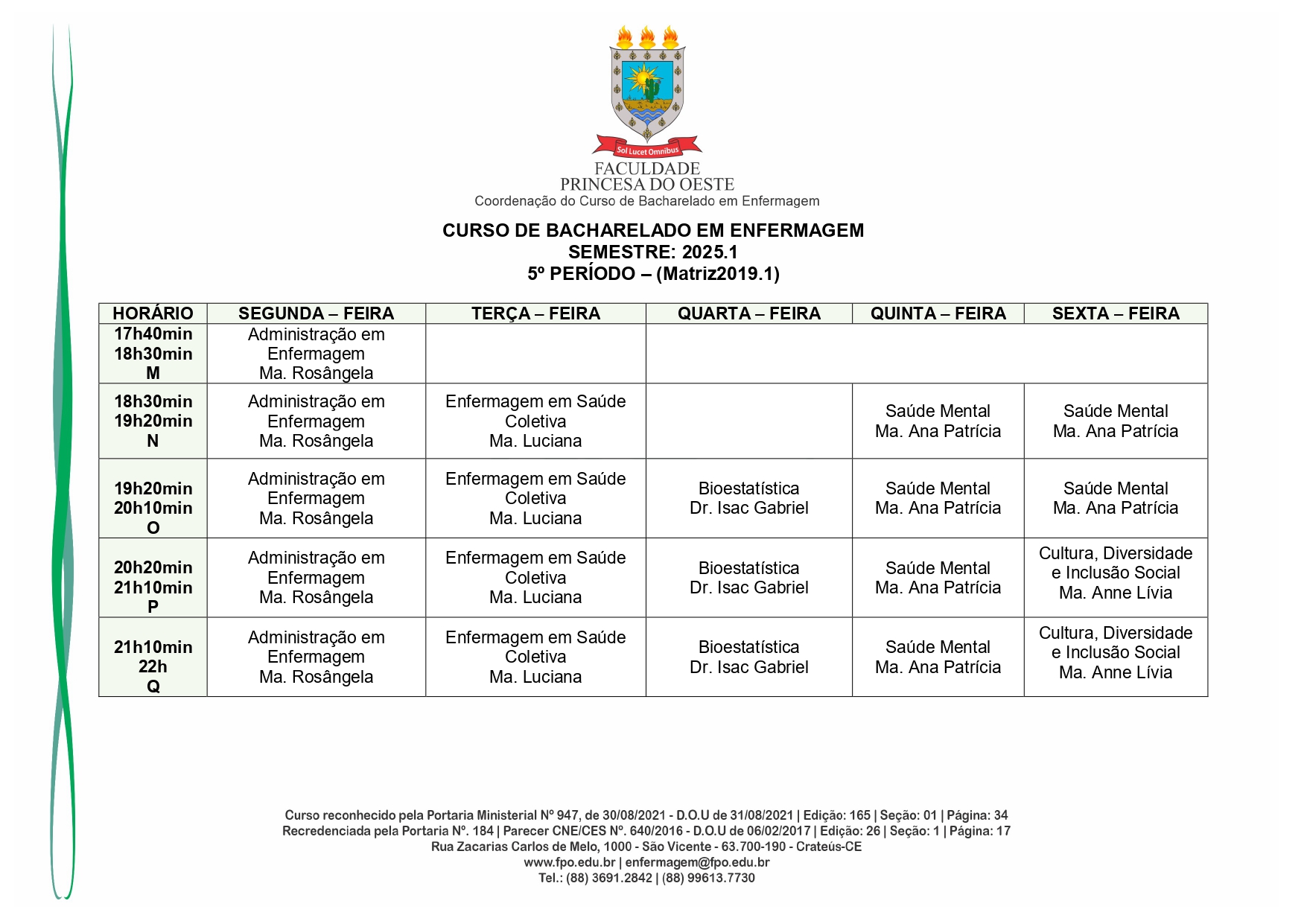 Reconhecido pelo MEC por meio da Portaria Nº 947, de 30 de agosto de 2021, o Curso de Bacharelado em Enfermagem é presencial, com 05 anos de formação, é voltado para a formação de profissionais na área da saúde, sendo qualificado o egresso em prestar toda assistência ao enfermo.